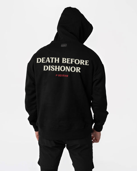 Crafted from a durable cotton blend and designed for a relaxed fit, the Death Before Dishonor Hoodie reminds the world of the limits we are willing to go to before ever surrendering what holds value to us. Featuring the official Death Before Dishonor mantra across the back and Printed Japanese Oni Mask logo on chest, as part of the limited edition Brandun Lee x BOXRAW collection. There's no giving in.